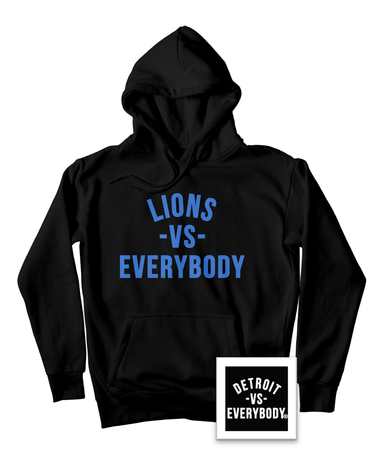 Get the official Lions vs Everybody Hoodie for you and your Crew. From the original Detroit vs Everybody team, this is perfect for family, friends and every Lions Den in America. PreOrder yours today!!! This authentic DETROIT VS EVERYBODY® Hoodie comes in Honolulu Blue & Black. Include it in your Detroit Flava Pack order, or purchase separately for yourself or as a gift.